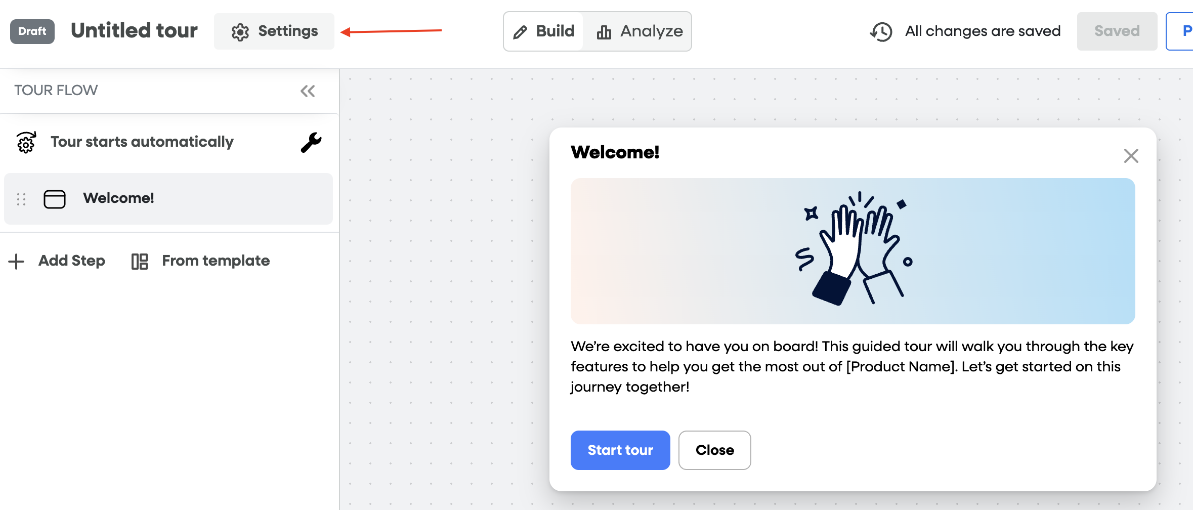 New tours are saved in Draft mode by default, making them invisible to users. Once you've completed your settings and added steps, save and publish your changes by clicking the 'Save' button.
