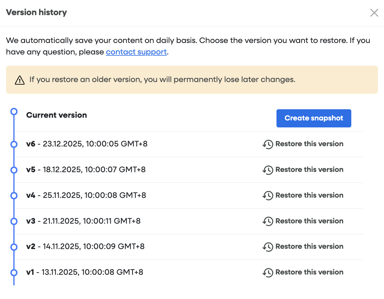 • Manual Snapshots: For extra security, you can manually create a content snapshot before making any major amendments. This allows you to capture a specific "clean" version of your tour before experimenting with new changes.