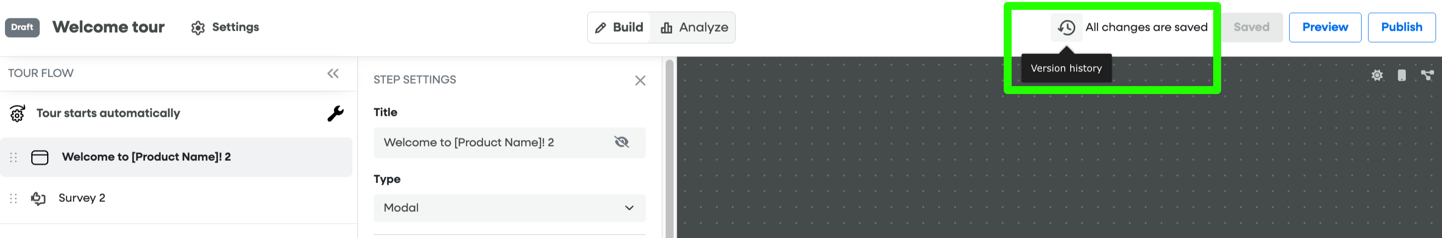 If the tour is Live, changes take effect as soon as you click Save. If the tour is a Draft, the changes are saved for you internally but will not be visible to your users until you publish the tour.