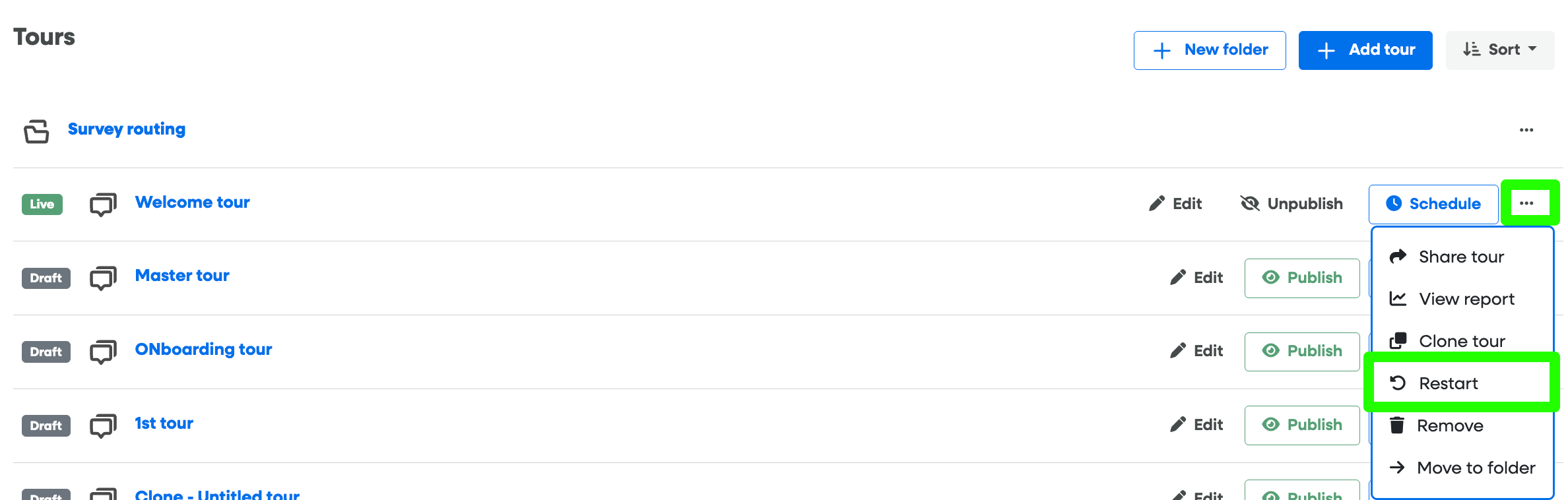The Restart Tour feature resets the completion status for all users. This is particularly useful after a major product redesign or a significant update to the tour flow.