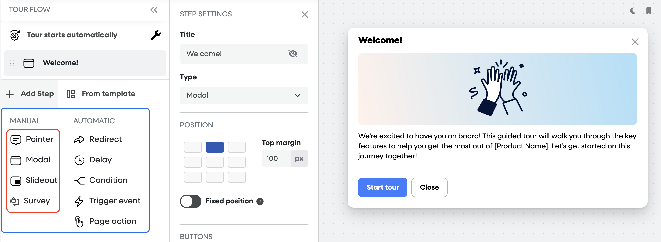 Manual steps are interactive prompts that require user action to proceed through a tour. These steps engage users, ensuring they understand and interact with key features before moving on to the next part of the journey.
